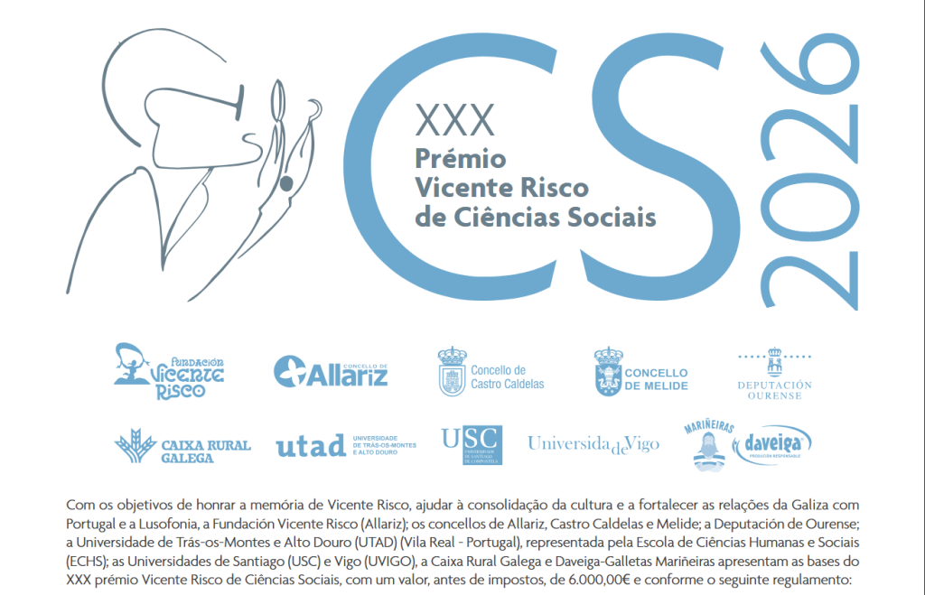 Até 28 de fevereiro de 2026 podem enviar os seus trabalhos para concorrer ao 30º prémio de investigação Vicente Risco de Ciências Sociais, de acordo com as bases abaixo. A autoria do trabalho vencedor receberá 6000 Euros e o trabalho será publicado e divulgado internacionalmente.