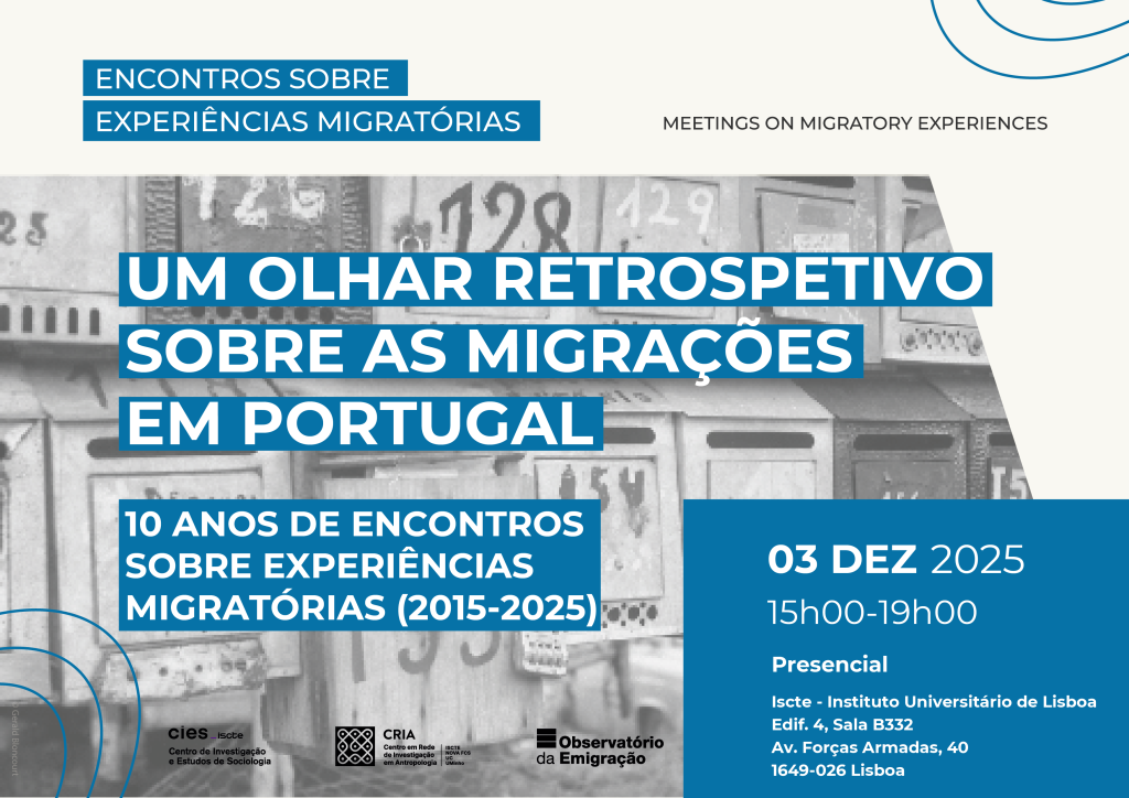 | Os Encontros sobre Experiências Migratórias celebram 10 anos e, por isso, o próximo encontro “Um olhar retrospetivo sobre as migrações em Portugal: 10 anos de Encontros sobre Experiências Migratórias” terá lugar no dia 3 de dezembro, entre as 15h e as 19h, na sala B332 do Edifício 4 do Iscte – Instituto Universitário de Lisboa. Ao longo desta década, os Encontros sobre Experiências Migratórias tornaram-se um espaço fundamental de reflexão, partilha e debate sobre os percursos, desafios e contributos das populações migrantes em Portugal. Nesta edição especial, vamos revisitar momentos marcantes, destacar aprendizagens e discutir perspetivas futuras sobre políticas, integração e diversidade. Entrada livre. |